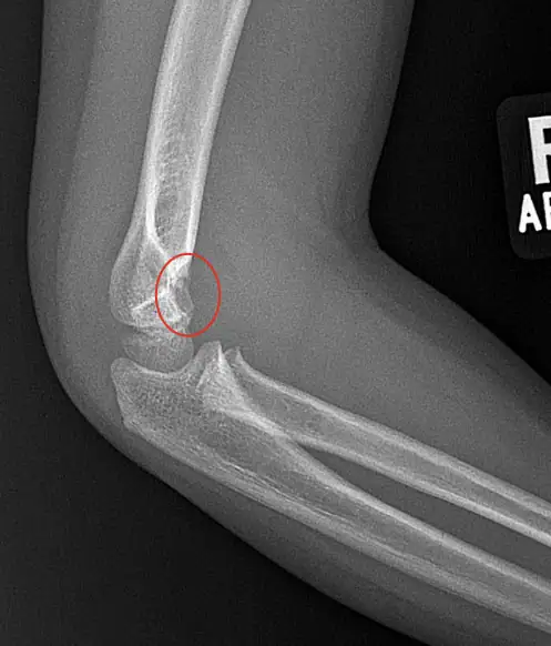 - On X-ray images, look for cortical irregularly or obvious fracture above the humeral condyles