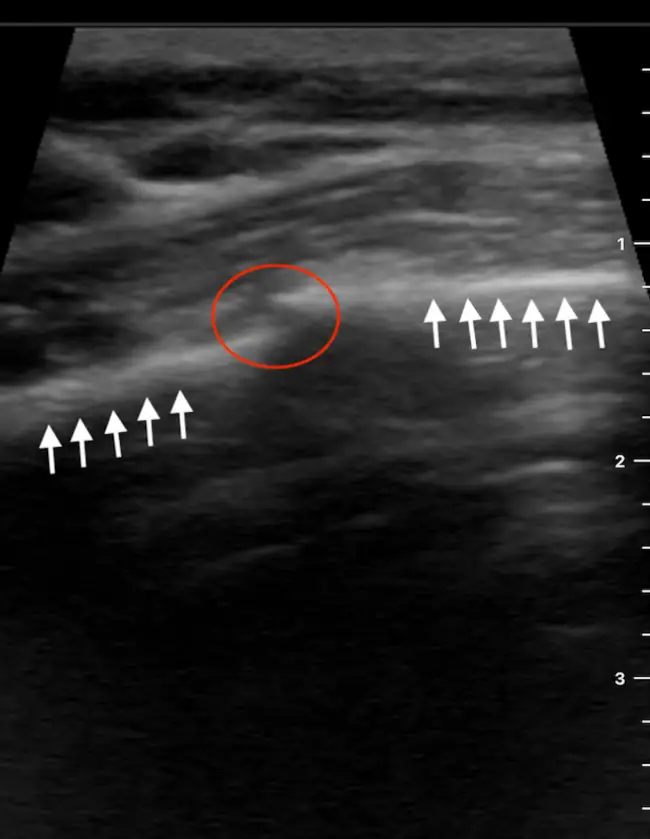 POCUS reveals a clear cortical interruption of the 4th anterior rib in the longitudinal plane. The linear hyperechoic bony cortex (white arrows) shows discontinuity with a minimal step-off (red circle) consistent with a nondisplaced rib fracture. There are no surrounding soft-tissue abnormalities, such as a hypoechoic mass suggestive of a hematoma or disruption of muscle architecture suggestive of a muscle tear.