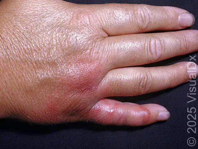 A 53-year-old male butcher visits urgent care for a painful red rash that developed on his hand 3 days prior. There is no history of recent travel, but he accidentally cut himself when processing meat 1 week ago. Exam reveals that the patient is febrile at 100.2° F. Otherwise, his vital signs are within normal limits, and he is well appearing. On dermatologic examination, erythematous vesiculated papules, plaques, and associated edema are visible on the hand and fingers.