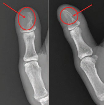 X-rays show soft tissue swelling and bony erosion of the distal phalanx, favoring osteomyelitis of the first digit. Osteomyelitis, a bone infection, can result from bacteremia or direct spread from adjacent joints or soft tissues. It can be either acute or chronic, and immunocompromised patients (particularly those with poorly controlled diabetes) are at increased risk. Osteomyelitis typically requires at least 1 cm of bone involvement (~40% mineral loss) to show on radiographs, with changes often visible 5–7 days after symptom onset in children and 10–14 days in adults. Magnetic resonance imaging is often required to confirm the diagnosis.