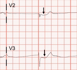 The correct diagnosis in this case is posterior myocardial infarction. The ECG shows a narrow complex, junctional bradycardia at a rate of 42. There are no discernible P waves (ruling out sinus bradycardia), and therefore no PR intervals (ruling out second degree AV block). There is focal ST-segment depression in V2 and V3, without ST-segment elevation elsewhere. The T-waves are not large in amplitude as expected with deWinter T-waves.