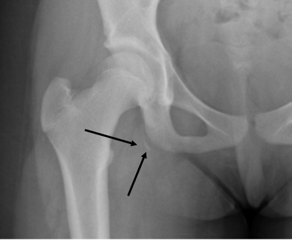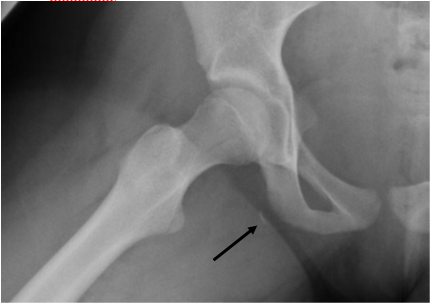 - Avulsion injury at the myotendinous junction causes a small sliver of bone to be separated, which visible on the radiograph.