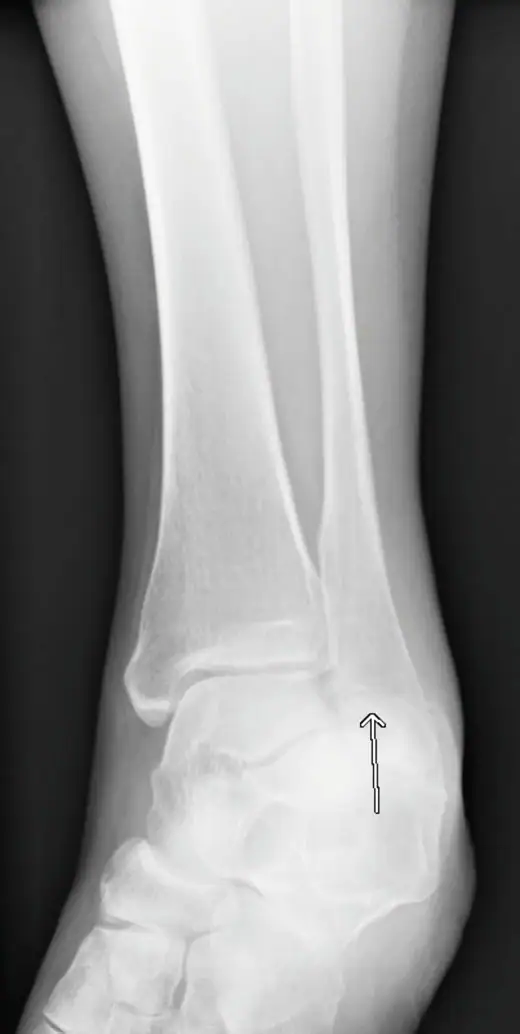 Diagnosis: The x-ray reveals a horizontal relatively nondisplaced fracture (arrow) of the lateral malleolus below the level of the talar plafond representing a Weber type A fracture or Lauge-Hansen supination adduction Stage I injury. A splint and referral to orthopedics for further management is appropriate for this patient.
