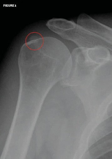 The x-ray shows calcification along the head of the humerus, which is consistent with a calcific tendinitis.