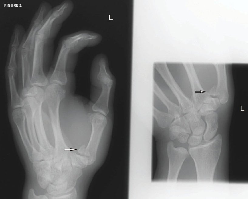 Diagnosis: The x-rays reveal a Bennett fracture (arrows).
