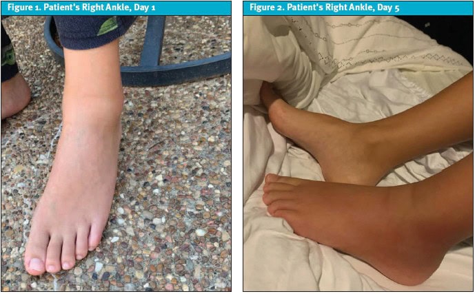 Case Resolution: The initial diagnosis was right ankle sprain, and treatment included supportive care. He had worsening symptoms over the next 5 days leading to an emergency department visit on day 5. The patient was transferred to a childrenโs hospital where magnetic resonance imaging revealed osteomyelitis and subperiosteal abscess in the distal fibula.