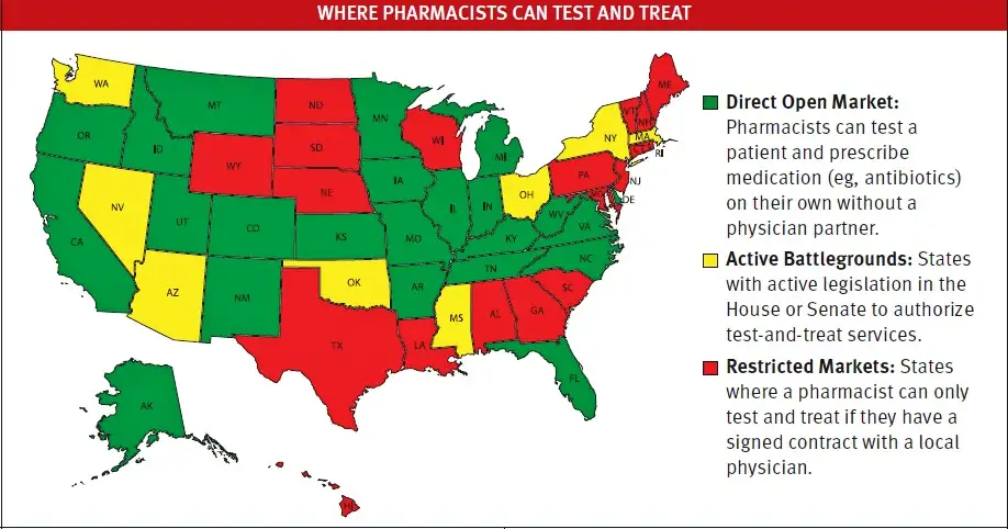 “Test and treat” legislation at the state level is transforming pharmacists from dispensers into providers, authorizing them to diagnose and prescribe for conditions like flu, strep, and COVID-19 without physician oversight. As the map illustrates, this model is now active in more than 20 “direct open market” states (green), with legislation pending in key “battleground” states (yellow).