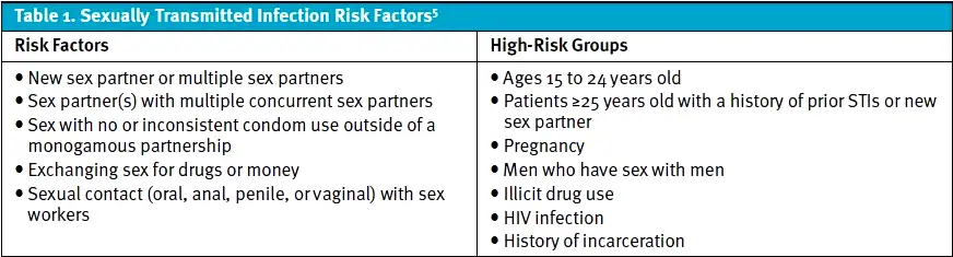 - Young sexually active patients or older patients with high-risk behaviors are at higher risk for acquiring STIs.
