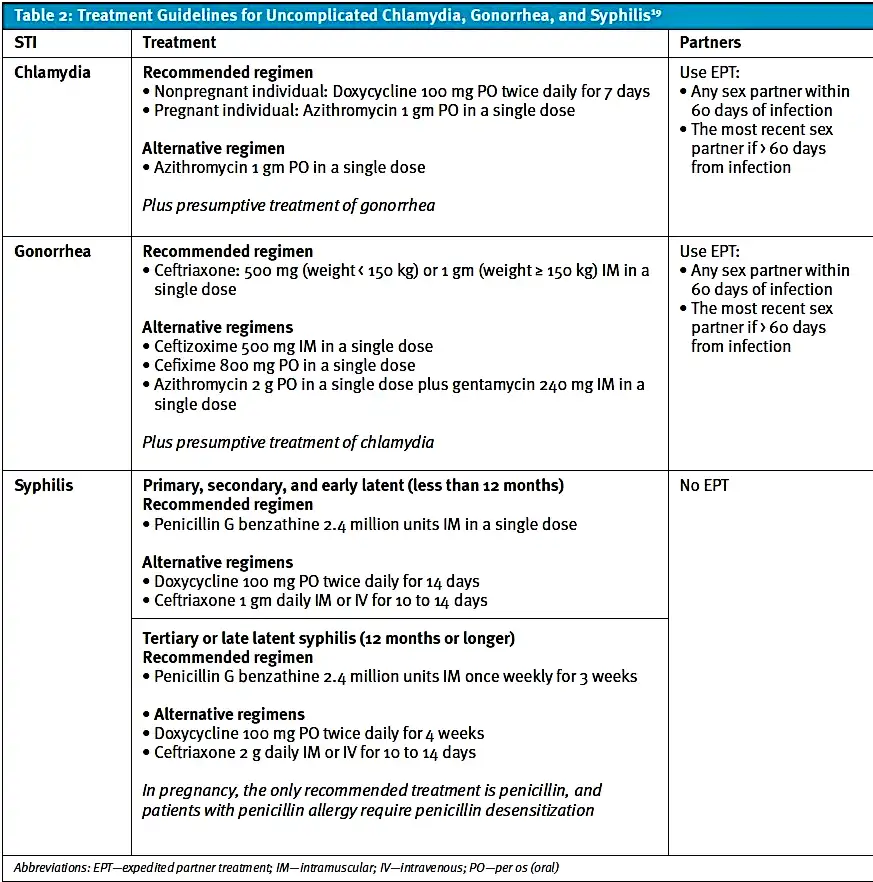 Pharmacologic treatment guidelines for STIs are concise and straightforward. For a suspected or confirmed diagnosis of an STI, the patient should be provided prescription medication and education about sexual health and protection. Additionally, the provider may offer expedited partner treatment (EPT). In 2021, the CDC updated its guidelines for the treatment of chlamydia, gonorrhea, and syphilis (Table 2).19