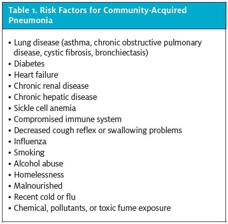 The two most important risk factors for patients developing CAP are extremes of age—children who are ≤2 years old and adults who are ≥65 years old. Other risk factors are listed in Table 1.